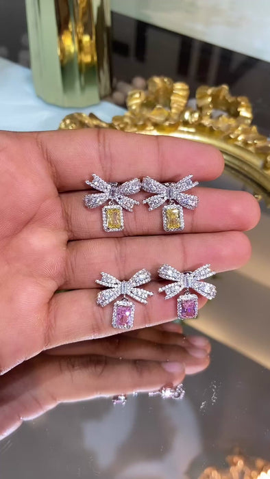 Add a playful touch to your look with these Colour Hanging Bow Earrings in cheerful yellow and pink. Lightweight and vibrant, they brighten any outfit while offering comfortable all-day wear. Perfect for adding a fun, feminine flair to your everyday style.