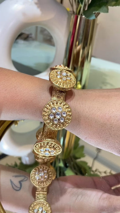 Elevate your bridal ensemble with the Varnika Green Meena Polki Kada pair. These openable bangles feature exquisite green enamel work combined with traditional polki stones, offering a perfect balance of elegance and comfort. Crafted to adorn your special day gracefully, they provide a charming touch that complements both classic and contemporary bridal looks. Ideal for weddings, these kadas celebrate heritage while ensuring ease of wear throughout your celebrations.